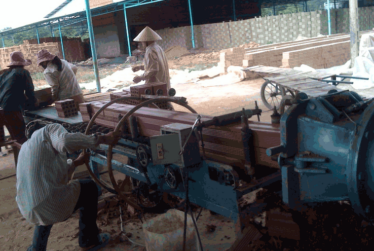 § Sau khi sơ chế nguyên liệu đất sét được đưa vào máy nhào trộn 2 trục để trộn với than cám đá nhằm đạt độ dẻo cần thiết để đưa qua máy đùn hút chân không đưa nguyên liệu vào khuôn để tạo ra sản phẩm gạch mộc (gạch chưa nung).